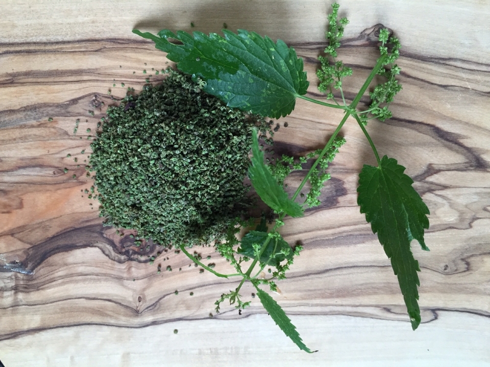 Auch die Brennnessel, eine meiner Lieblingspflanzen, weil sie mich das ganze Jahr mit ihrer Kraft begleitet, hat aus den kleinen, weissen, unscheinbaren Blüten ihre Samen hervorgebracht. Ich sammle sie schon seit Mitte August. Mit etwas Mut kann man sie ohne Handschuhe oder sonstigen Schutz von den Pflanzen abpflücken. Dann lasse ich sie 2-3 Tage trocknen, und streiche sie liebevoll von den Strängen ab. Das dauert ein Weilchen, aber irgendwie mache ich es gerne – es ist beruhigend, fast meditativ, wenn man einfach nur das tut. Zum Aufbewahren gebe ich die Brennnesselsamen in ein verschlossenen Glas und stelle sie an einem dunklen, kühlen Ort. Bis zum nächsten Sommer sind sie sicher aufgebraucht, denn sie schmecken auch noch schön nussig.